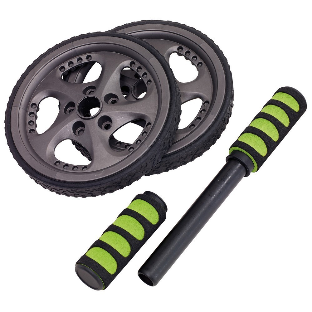 Contine 2 roti din plastic invelite in cauciuc, bara de metal, 2 manere antialunecare invelite in spuma, ambalate separat in cutie.