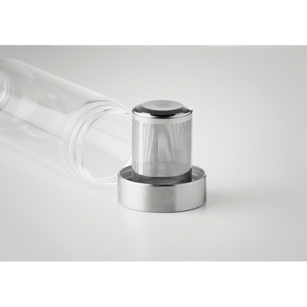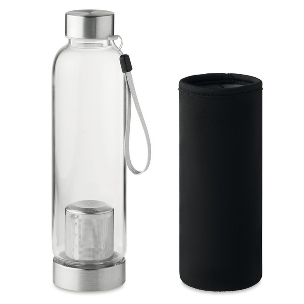 Sticla de baut, cu perete simplu din borosolicat masiv, cu strecurator pentru ceai si husa din neopren.
