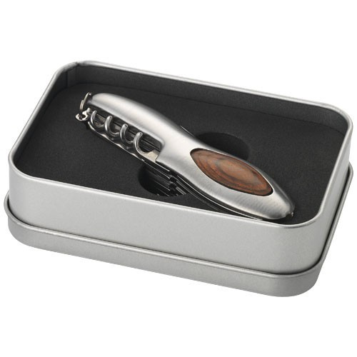 Briceag de buzunar cu 15 functii si insertie de lemn.