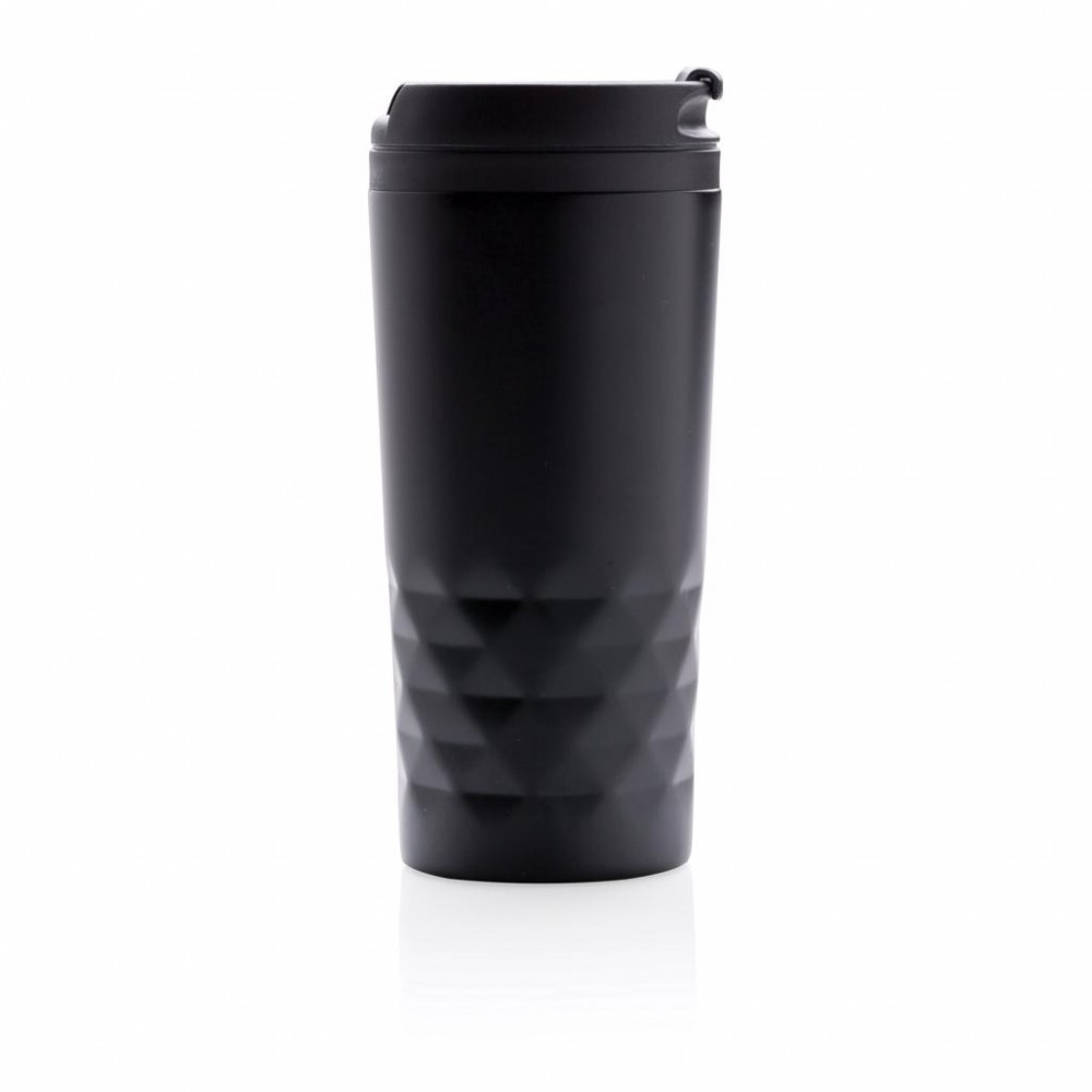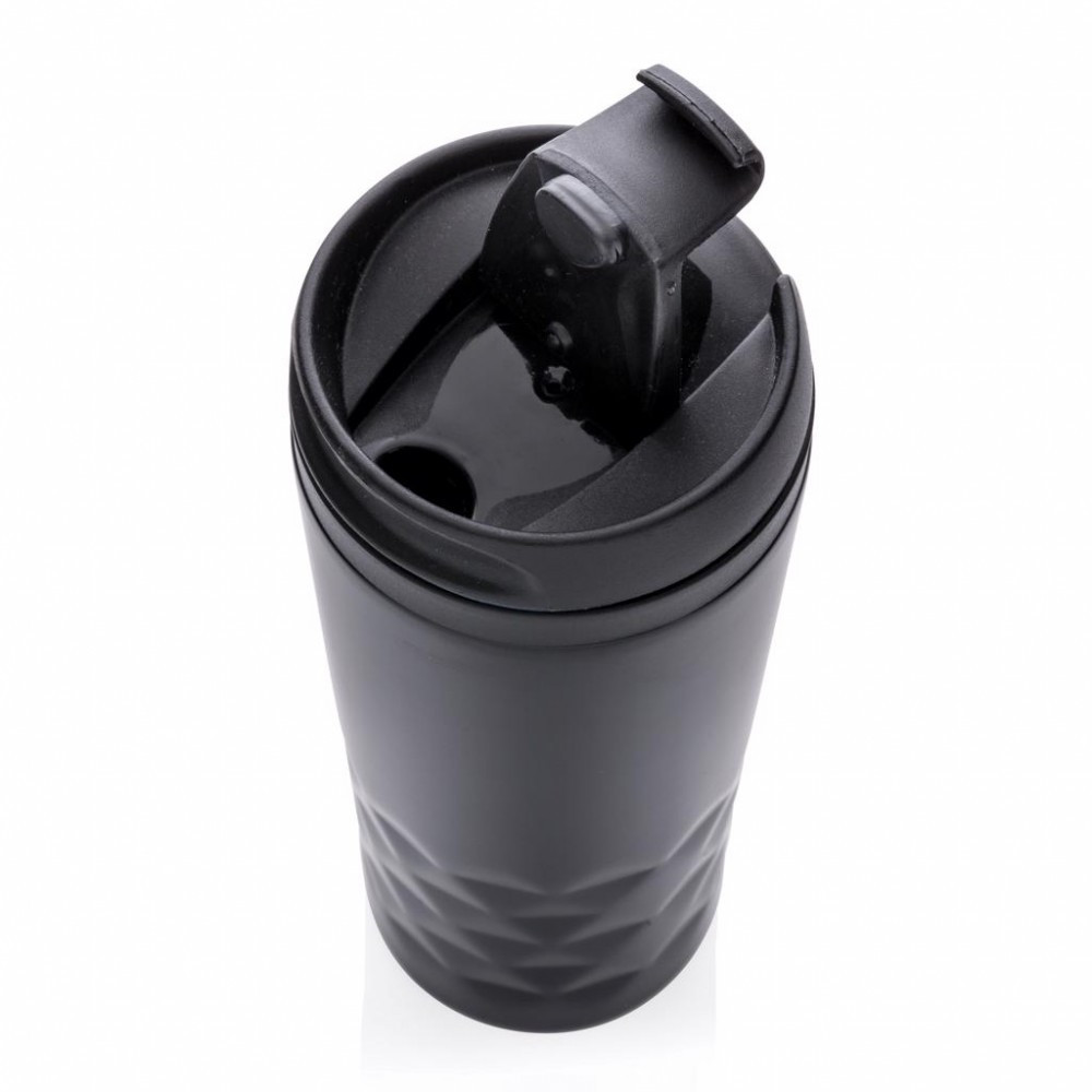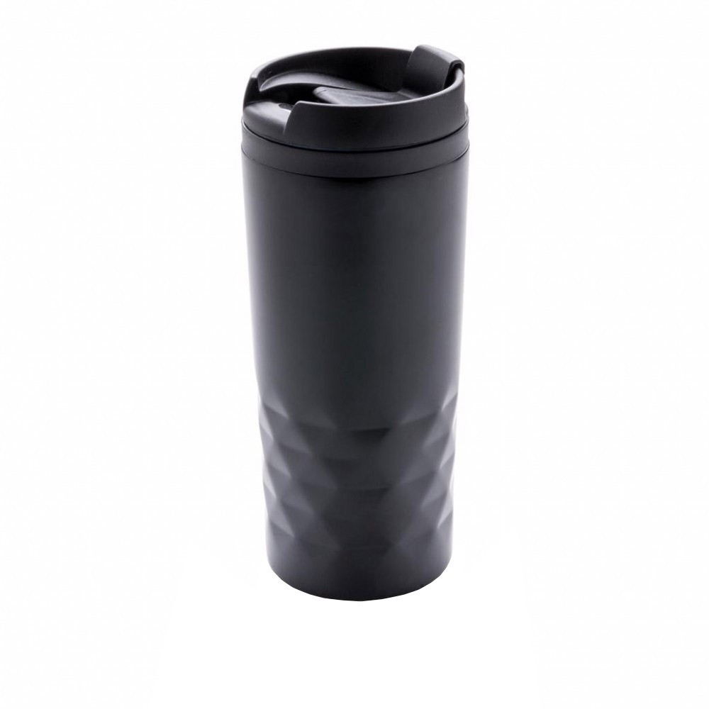 Cana de voiaj eleganta realizata din otel inoxidabil, cu detalii geometrice.