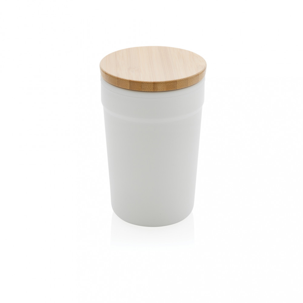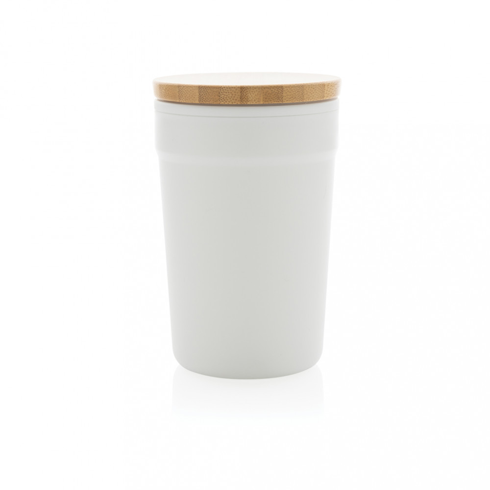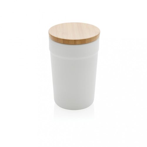 Acest pahar frumos cu capac din bambus este realizat din PP reciclat certificat GRS.