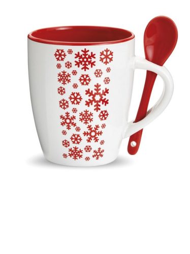 Cana din ceramica cu lingurita inclusa, model cu flugi de zapada, ambalata in cutie asortata.