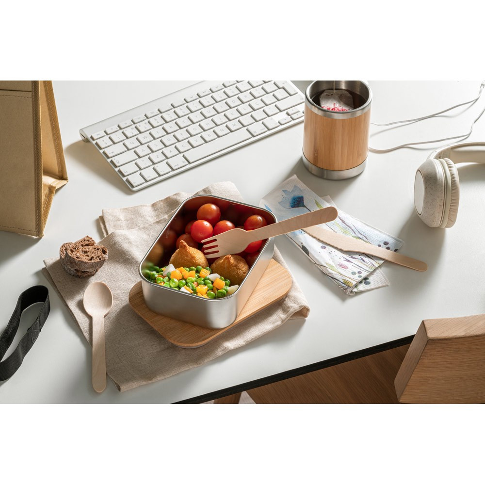 Cutie de pranz din otel inoxidabil cu capac din bambus si banda elastica pentru transport in siguranta.