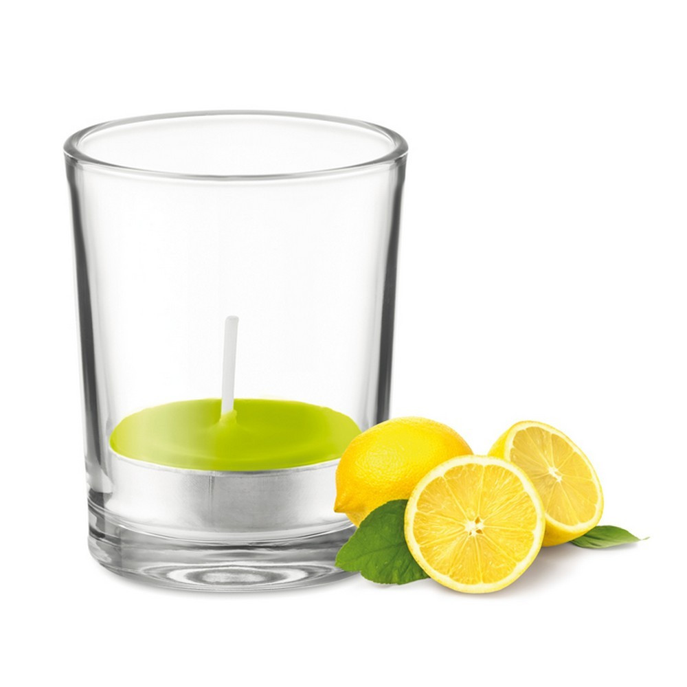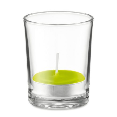 Lumanare colorata si aromatizata in suport transparent din sticla.