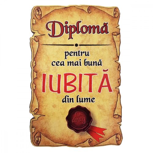 Un magnet rustic realizat din lemn, reprezentand o diploma tip papirus, oferita cu drag, pentru Cea mai buna IUBITA din lume.