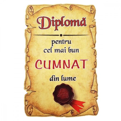 Un magnet rustic realizat din lemn, reprezentand o diploma tip papirus, oferita cu drag, pentru Cel mai bun CUMNAT din lume.