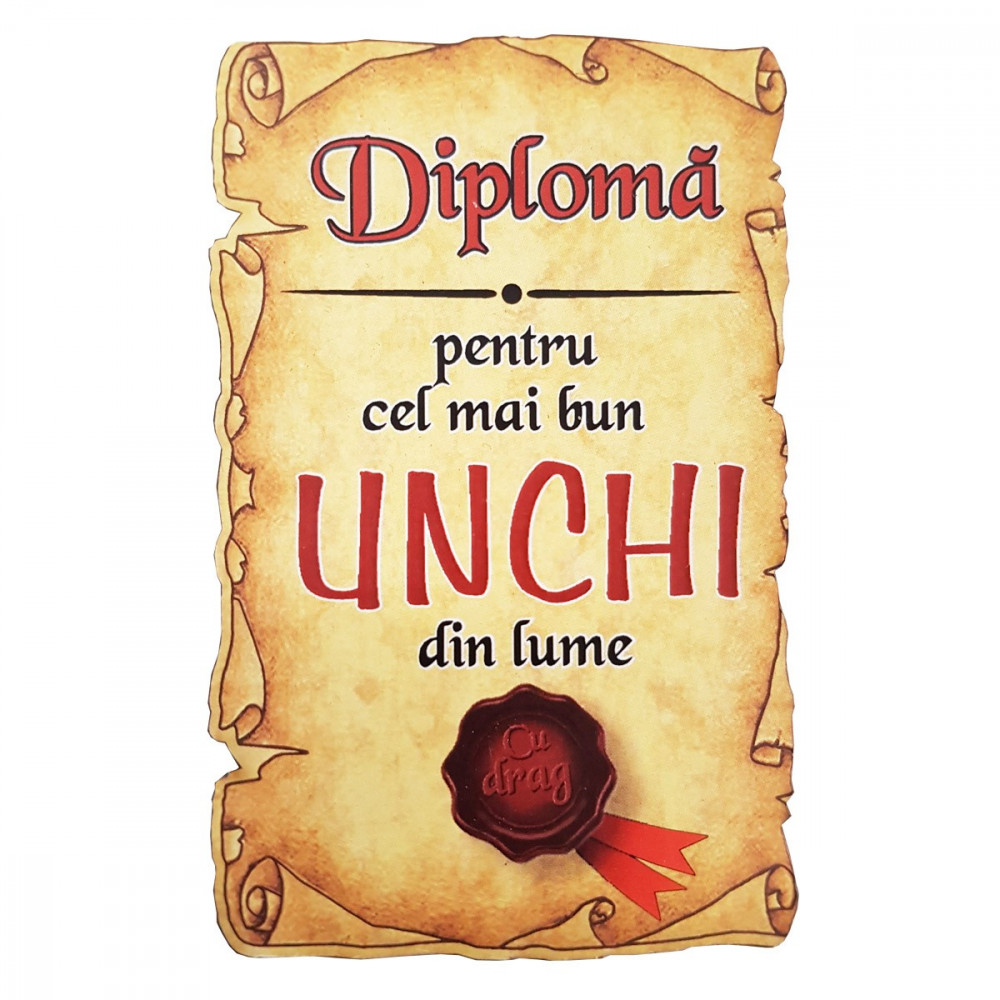 Un magnet rustic realizat din lemn, reprezentand o diploma tip papirus, oferita cu drag, pentru Cel mai bun Unchi din lume.