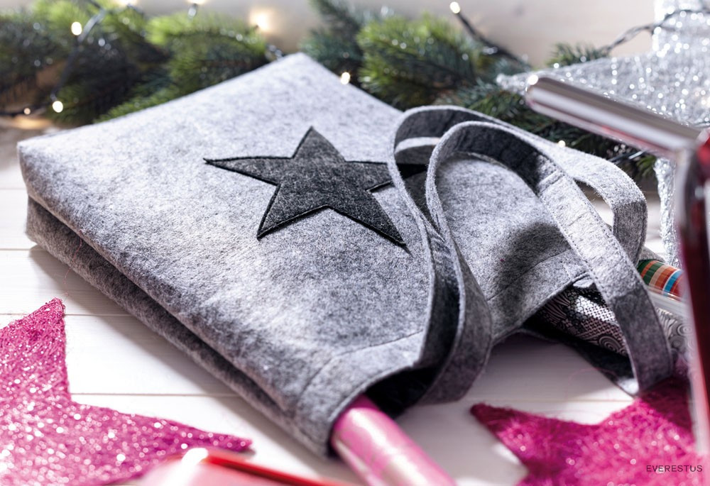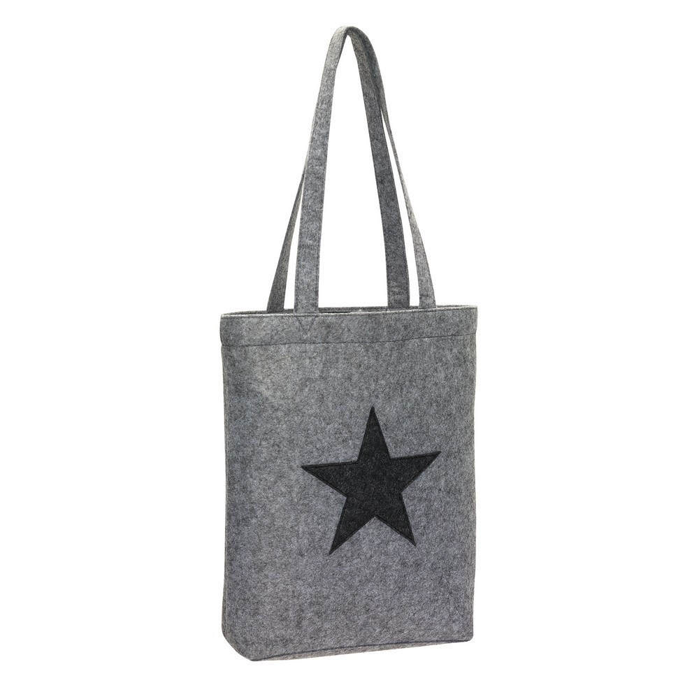 Sacosa cu inchedere cu scai, 2 manere lungi si stea cusuta pe suprafata.