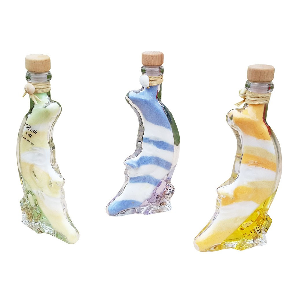 In interiorul sticlutei cu Sare de baie decorativa Luna albastra 22 cm, gasesti nuante de albastru in degrade combinat cu alb, granulatie fina si lumanare tip gel decorata cu scoici de diferite dimensiuni.