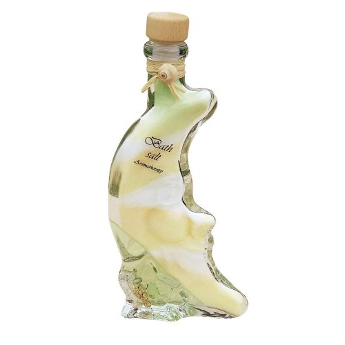 In interiorul sticlutei cu Sare de baie decorativa Luna galbena 22 cm, gasesti nuante de galben in degrade combinat cu alb, granulatie fina si lumanare tip gel decorata cu scoici de diferite dimensiuni.