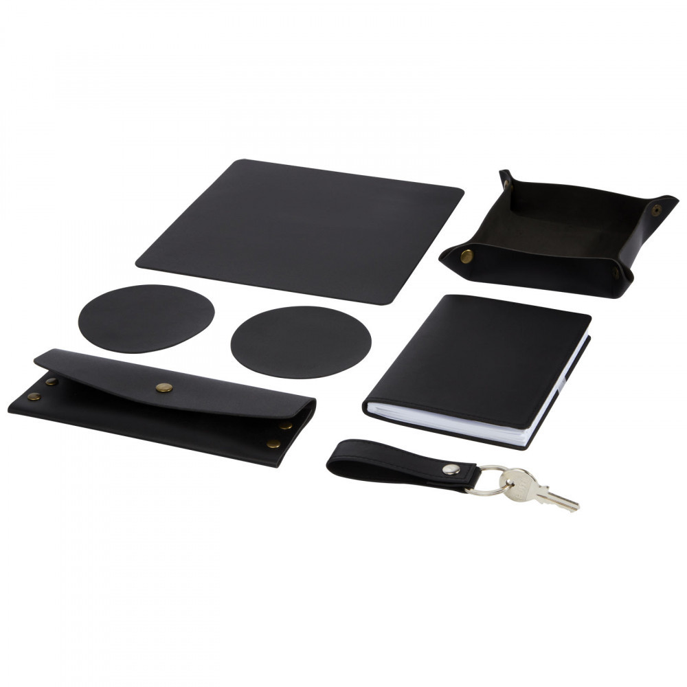 Set de birou de lux format dintr-o husa pentru pix, un caiet, un mouse pad, un suport pentru chei, un set de coaster si o tava pentru a tine chei, monede si accesorii mici.