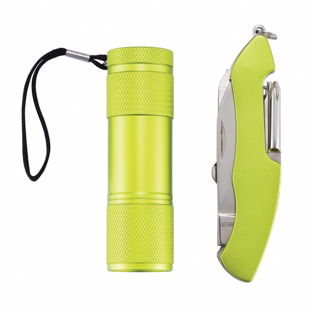 Setul este compus dintr-un briceag din aluminiu mat anodizat si lanterna.