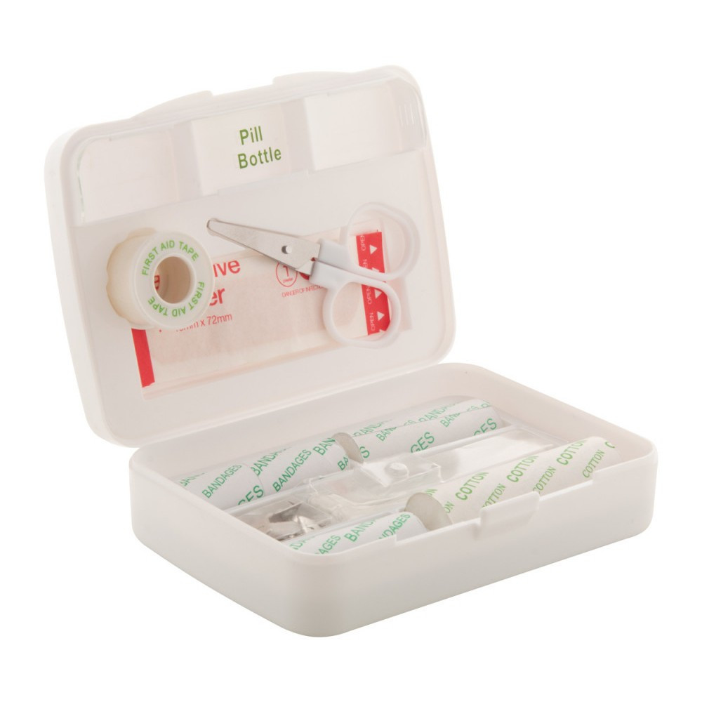 Trusa compacta de prim ajutor in cutie alba din plastic.