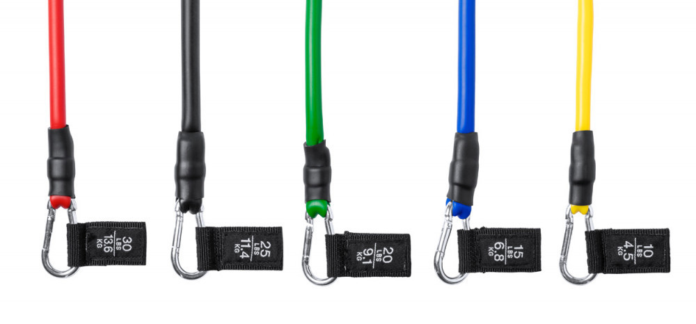 Include 5 benzi elastice de rezistenta diferita din cauciuc TPE, o pereche de manere captusite, o pereche de curele pentru glezne si o ancora de usa.