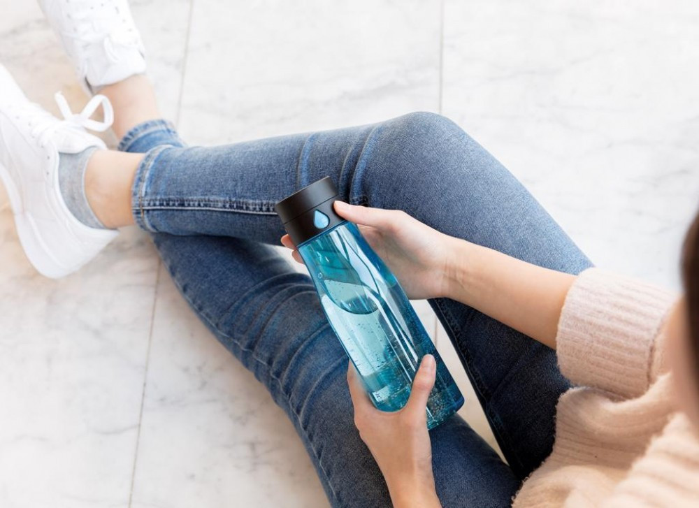 Capacul afiseaza o picatura mai mare de apa, de fiecare data cand o umpleti si rasuciti capacul. Astfel, puteti monitoriza numarul de sticle pe care le beti.