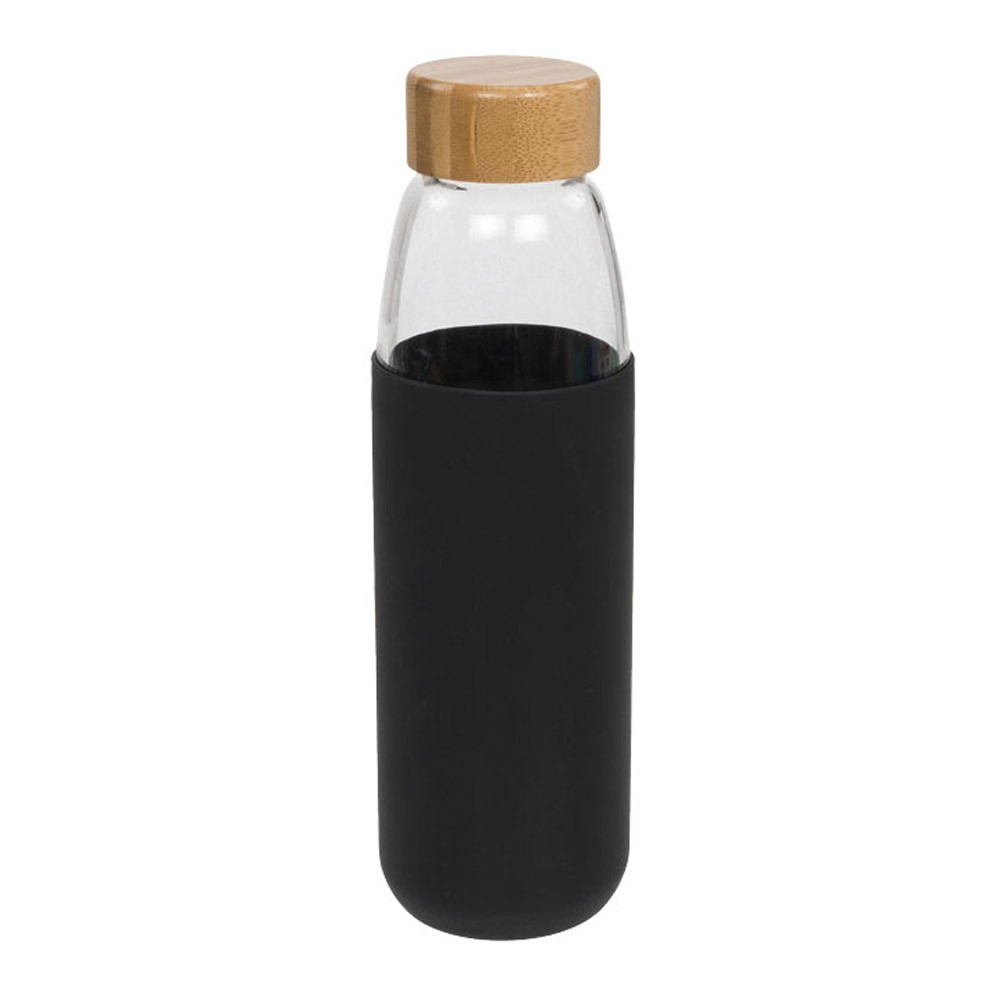 Sticla sport 540 ml cu capac din lemn, Everestus, KI, sticla, silicon si lemn, negru