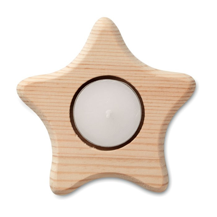 Suport pentru lumanare, realizat din lemn natur, in forma de stea.