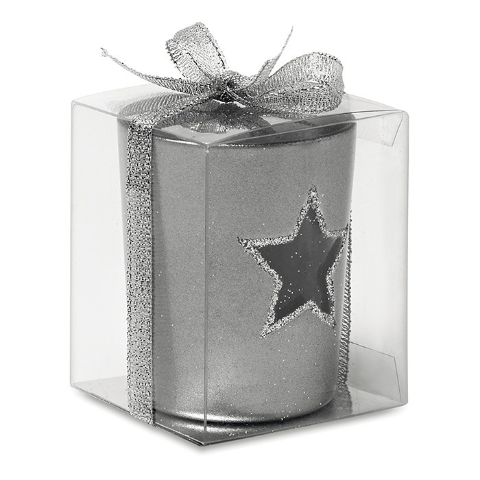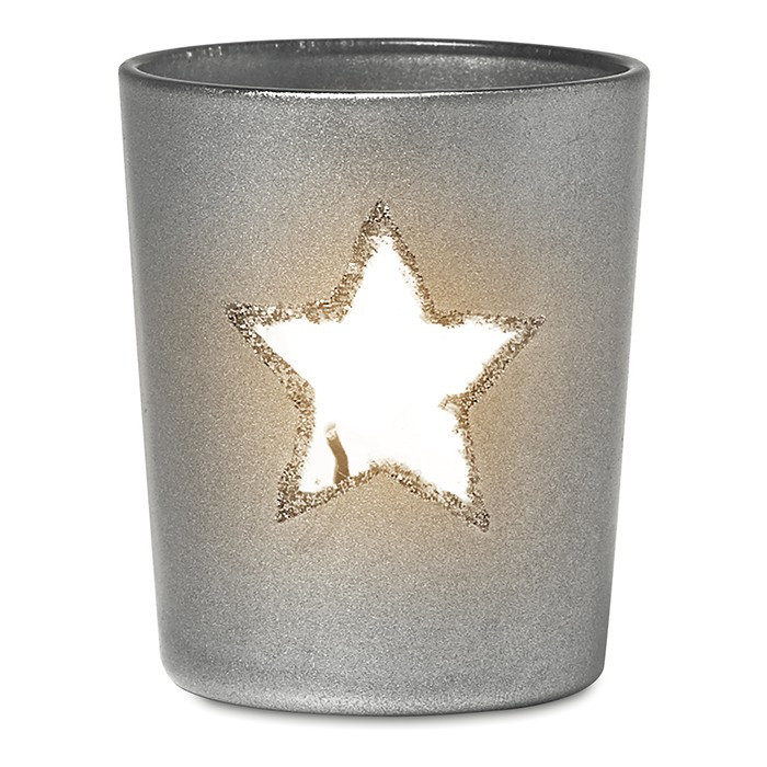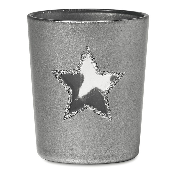 Suport din sticlă pentru lumânare, cu motive stea cu sclipici.