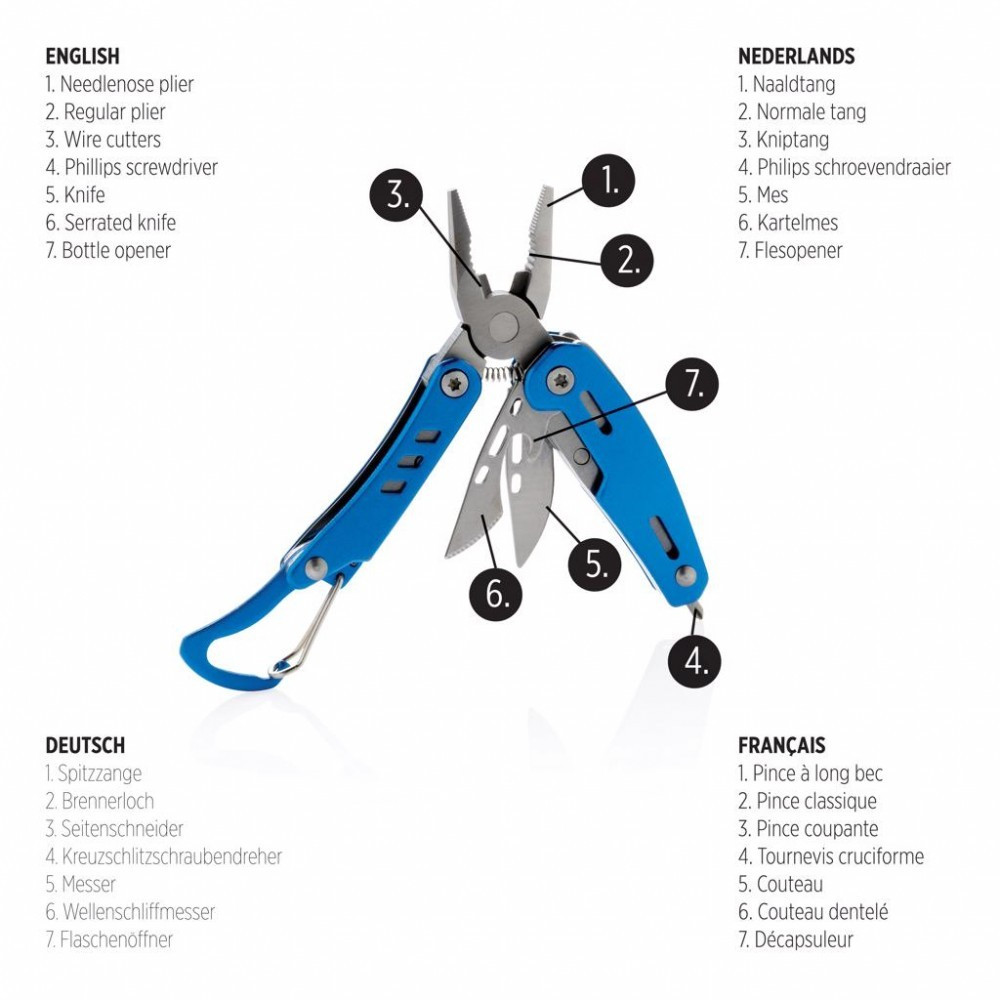 Unealta multifunctionala 7 functii, solida, cu carabina, Everestus, SD, aluminiu, otel inoxidabil, albastru