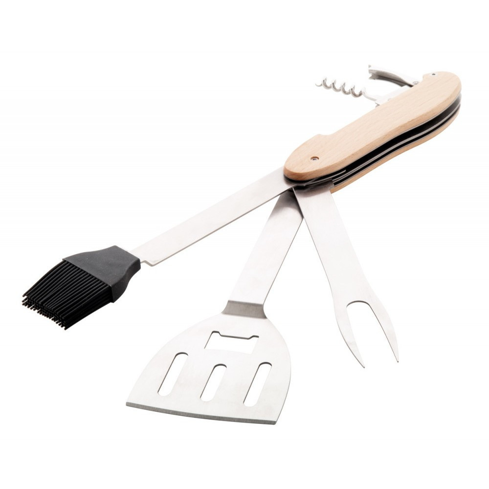 Unealta pliabila pentru gratar 5-in-1, din otel inoxidabil, cu maner din lemn.